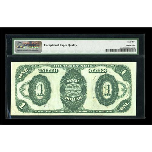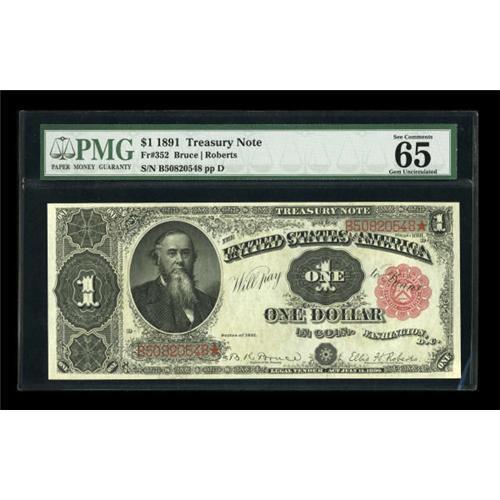 <B>Fr. 352 $1 1891 Treasury Note PMG Gem Uncirculated 65 EPQ.</B></I> A fully Gem Stanton Treasury Ace that carries the "Exceptional Paper Quality" comment. Scarce in the grade and extremely popular.<BR><BR><b>Shipping:</b> Coins & Currency (<a target="_blank" href="http://www.heritageauctions.com/common/shipping.php">view shipping information</a>)