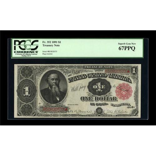 <B>Fr. 352 $1 1891 Treasury Note PMG Superb Gem Unc 67 EPQ.</B></I> This richly colored example bears some of the deepest and fullest embossing that we have ever seen from this series. It is perfectly centered on both sides, has ample margins, and the paper is virtually flawless. It is absolutely unquestionably original, and has a crackling fresh appearance that likely rivals that of the day it left the press more than a century ago. A stunning example of this type note that should interest collectors who are interested in only the finest...that description worked when the note was raw, and PCGS seems to have agreed. <BR><BR><b>Shipping:</b> Coins & Currency (<a target="_blank" href="http://www.heritageauctions.com/common/shipping.php">view shipping information</a>)