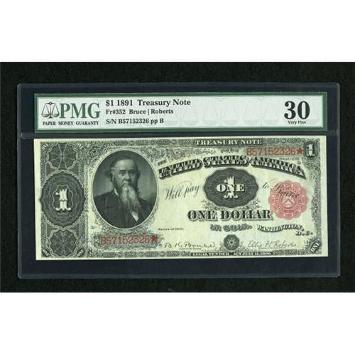 <B>Fr. 352 $1 1891 Treasury Note PMG Very Fine 30.</B></I> The overall eye appeal for this note is exceptional given the grade. This piece likely circulated for only a short time.<BR><I>From The Warren Marshall Collection</B></I><BR><BR><b>Shipping:</b> Coins & Currency (<a target="_blank" href="http://www.heritageauctions.com/common/shipping.php">view shipping information</a>)