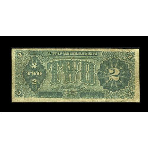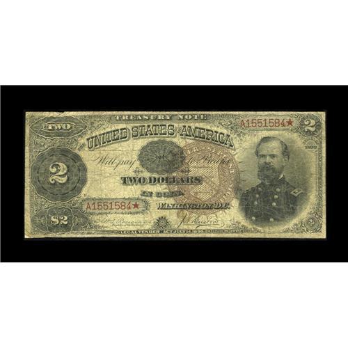 <B>Fr. 353 $2 1890 Treasury Note Good-Very Good.</B></I> This $2 Treasury or Coin Note is of the scarcer, earlier back design. This example exhibits plenty of circulation, but no real problems. All serial numbers for this issue end in solid stars since in this case, they are printer's embellishment marks to indicate the end of the serial number. Hollow star notes for replacement note purposes were not used until 1910.