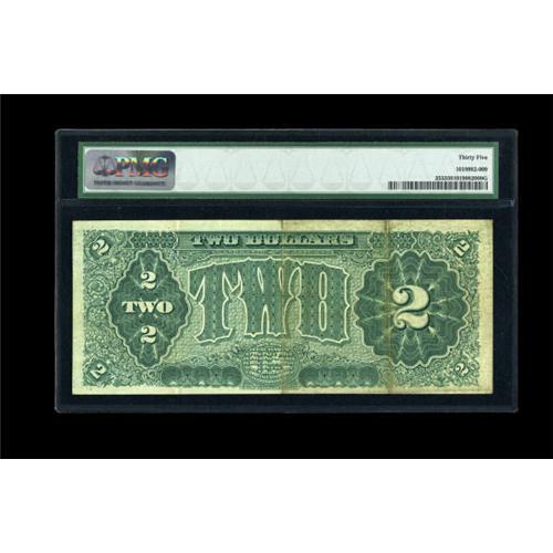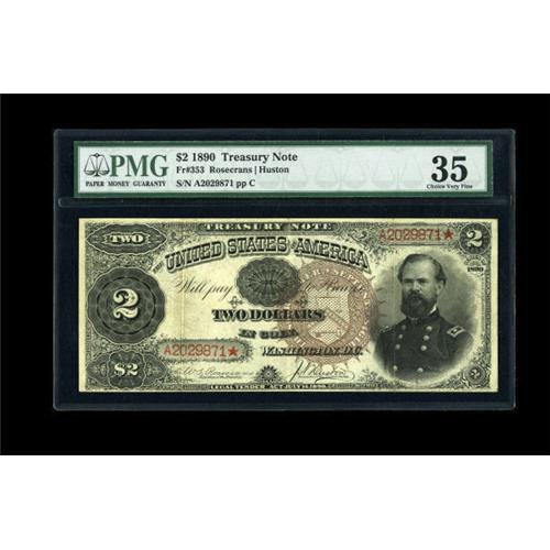 <B>Fr. 353 $2 1890 Treasury Note PMG Choice Very Fine 35.</B></I> The $2 Series 1890 notes are among the most difficult design types to acquire in decent circulated grades, or, for that matter, in any grade. PMG has graded only forty-five examples from this series in all signature combinations and grades combined. The color is strong and the margins decent on this PMG Choice Very Fine 35 example.<BR><BR><b>Shipping:</b> Coins & Currency (<a target="_blank" href="http://www.heritageauctions.com/common/shipping.php">view shipping information</a>)