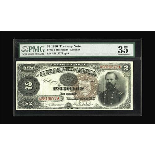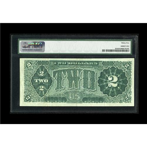 <B>Fr. 354 $2 1890 Treasury Note PMG Very Fine 35.</B></I> Very few pieces that receive this grade from a third party grading service are as nice or original. The margins are broad and while the folds that account for the grade appear heavy, they do not interrupt the design. The design of the 1890 $2 Treasury Note ranks at No. 15 in the book <I>100 Greatest American Currency Notes</B></I> book.<BR><I>From The Troy Wiseman Collection</B></I>