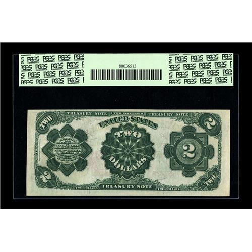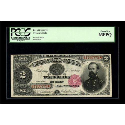<B>Fr. 356 $2 1891 Treasury Note PCGS Choice New 63PPQ.</B></I> The scarcest of the 1891 Treasury Deuces--and a very nice example at that. It appears that all that separates this deeply embossed note from the full Gem grade is its somewhat tight top margin both on the face and back.<BR><BR><b>Shipping:</b> Coin/Currency (<a target="_blank" href="http://www.heritageauctions.com/common/shipping.php">view shipping information</a>)