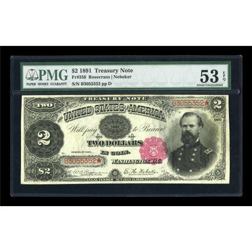 <B>Fr. 356 $2 1891 Treasury Note PMG About Uncirculated 53 EPQ.</B></I> A nice About New example of a General McPherson Treasury Deuce. McPherson was the highest-ranking Union General to die in combat during the Civil War. The note has wonderful color and much of the look of a perfect Gem when viewed from the face. A single light fold and some very minor soil is visible from the back. Only 102 examples of Fr. 356 are known in all grades combined.<BR><BR><b>Shipping:</b> Coins & Currency (<a target="_blank" href="http://www.heritageauctions.com/common/shipping.php">view shipping information</a>)