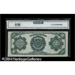 Fr. 357 $2 1891 Treasury Note CGA Choice Uncirculated 6 <B>Fr. 357 $2 1891 Treasury Note CGA Choice Uncirculated 64.</B></I> Rather tight across the top, but with the full appearance of a Gem in every other respect. The original embossing is sufficiently pronounced for it to show through the third-party holder. <BR><BR><B>Important notice:</B> Heritage usually auctions material at the rate of 200-250 lots per hour. On some occasions eBay Live bid software or the Internet may not be able to keep up with the pace of the auction. We recommend placing a realistic absentee bid now as insurance to avoid disappointment. Occasionally the auctioneer may eliminate or reject an eBay Live bid, and the auctioneer may also reopen a lot after the close of the eBay live bidding (usually because we missed an audience bid), and may reject your bid even if it shows you as the winning bidder. By bidding via eBay Live, you agree that Heritage may award the lot to another bidder at its sole discretion under the circumstances described above or any other reasonable circumstances. Since eBay bids are not shown to us until we open the lot on the floor, we treat those bids just like floor bids. In most cases the floor responds before the eBay bid is presented to us, due to Internet lag time, so for consistency we have made it a policy that floor bids are always considered first over tie eBay live bids. Also please note that all Heritage lots purchased through eBay Live carry a 20% Buyer's Premium. Please make sure you read the Terms and Conditions before you bid. This lot is being auctioned in conjunction with a live floor auction by Heritage Galleries & Auctioneers. All final auction and invoice information will be supplied by Heritage Galleries & Auctioneers, and all other information should be considered preliminary. Lot:17570