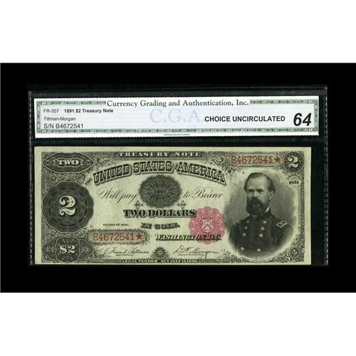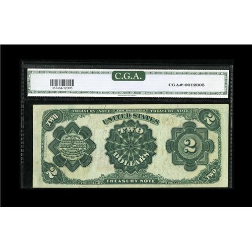 <B>Fr. 357 $2 1891 Treasury Note CGA Choice Uncirculated 64.</B></I> This Treasury Deuce has bright colors and good original embossing. The printing is sharp, and the McPherson portrait is particularly lifelike. With slightly more margin at bottom, this pretty piece would fully qualify for the Gem grade.