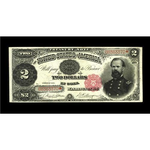 <B>Fr. 357 $2 1891 Treasury Note Choice New.</B></I> Sufficient margins add to the overall eye appeal of this McPherson Deuce. The embossing is solid and clearly visible on the back of the note.<BR><I>From The Bill and Kathy Stella Currency Collection</B></I><BR><BR><b>Shipping:</b> Coin/Currency (<a target="_blank" href="http://www.heritageauctions.com/common/shipping.php">view shipping information</a>)