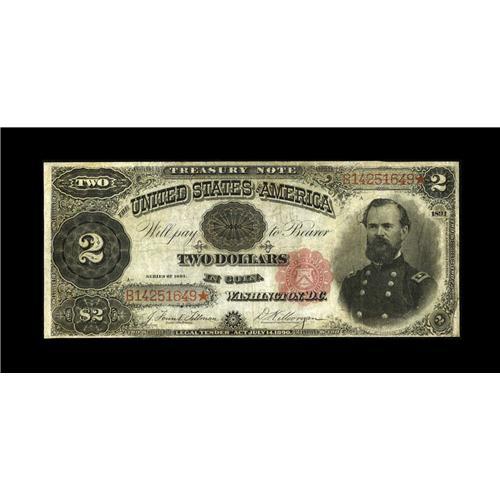 <B>Fr. 357 $2 1891 Treasury Note Fine.</B></I> Despite a couple of hindrances to the originality, this McPherson Deuce faces up very well. All of the design elements are solid as is the overall color. A couple of spots of restoration are noted including the lower right corner.<BR><BR><b>Shipping:</b> Coin/Currency (<a target="_blank" href="http://www.heritageauctions.com/common/shipping.php">view shipping information</a>)