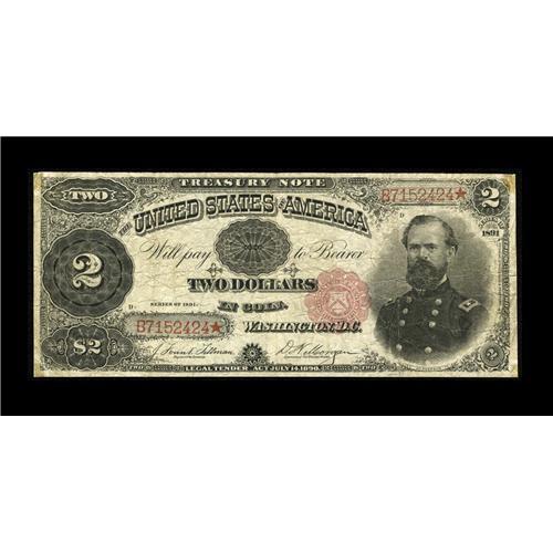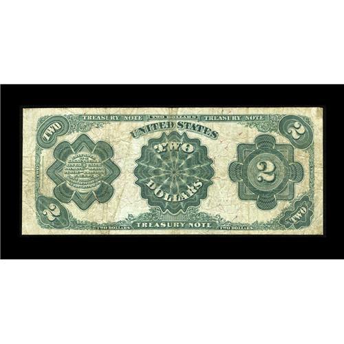 <B>Fr. 357 $2 1891 Treasury Note Fine.</B></I> The paper is solid both internally and at the margins, and none of the folds that account for the grade is significant. This piece may have spent some time in the notebook of an old time collection as there is evidence at the corners that it was once held in place for display.<BR><I>From The Plymouth Rock Collection</B></I>