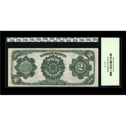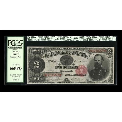 <B>Fr. 357 $2 1891 Treasury Note PCGS Gem New 66PPQ.</B></I> A really gorgeous McPherson Deuce, with bold, original embossing that can be clearly seen through the holder as well as broad margins and ideal color of the paper and inks. This is a very tough type to find this nice.