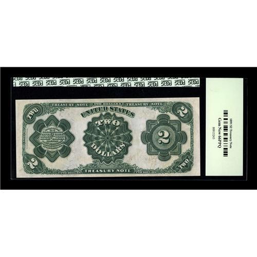 <B>Fr. 357 $2 1891 Treasury Note PCGS Gem New 66PPQ.</B></I> A really gorgeous McPherson Deuce, with bold, original embossing that can be clearly seen through the holder as well as broad margins and ideal color of the paper and inks. This is a very tough type to find this nice.<BR><BR><b>Shipping:</b> Coins & Currency (<a target="_blank" href="http://www.heritageauctions.com/common/shipping.php">view shipping information</a>)