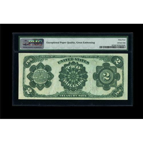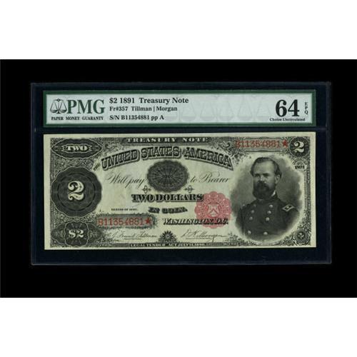 <B>Fr. 357 $2 1891 Treasury Note PMG Choice Uncirculated 64 EPQ.</B></I> This Treasury Deuce has bright colors and phenomenal original embossing. The printing is sharp, and the McPherson portrait is particularly lifelike. With slightly more bottom margin, this pretty piece would fully qualify for the Gem grade.<BR><BR><b>Shipping:</b> Coins & Currency (<a target="_blank" href="http://www.heritageauctions.com/common/shipping.php">view shipping information</a>)