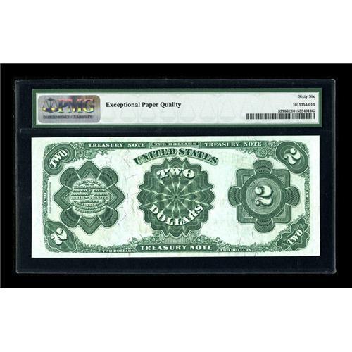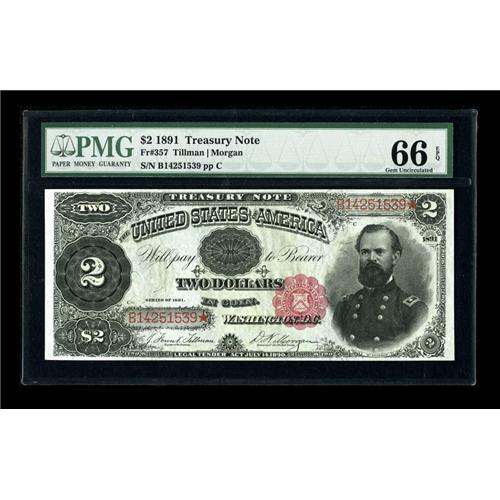 <B>Fr. 357 $2 1891 Treasury Note PMG Gem Uncirculated 66 EPQ.</B></I> The original embossing on this high end McPherson Deuce can be very easily seen through the third party holder. The margins are as broad as one would expect on a 66 and the colors are simply perfect.<BR><BR><b>Shipping:</b> Coins & Currency (<a target="_blank" href="http://www.heritageauctions.com/common/shipping.php">view shipping information</a>)