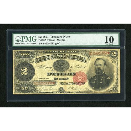 <B>Fr. 357 $2 1891 Treasury Note PMG Very Good 10.</B></I> This McPherson Deuce is attractive for the grade with fully detailed devices and a bright remaining overprint.<BR><BR><b>Shipping:</b> Coins & Currency (<a target="_blank" href="http://www.heritageauctions.com/common/shipping.php">view shipping information</a>)