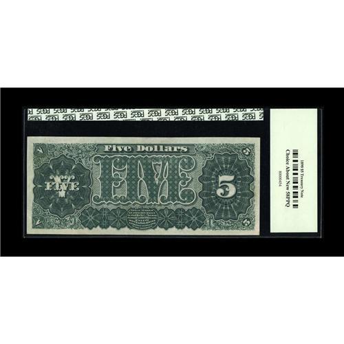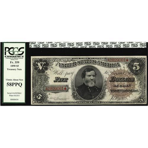 <B>Fr. 359 $5 1890 Treasury Note PCGS Choice About New 58PPQ.</B></I> The tiniest of corner bends accounts for the grade on this otherwise full Choice New issue. We agree with the PPQ designation as the paper is bright, the embossing original, and the color exceptional. This design type is listed at No. 90 in the book <I>100 Greatest American Currency Notes.</B></I><BR><I>From The Troy Wiseman Collection</B></I>