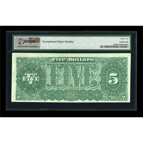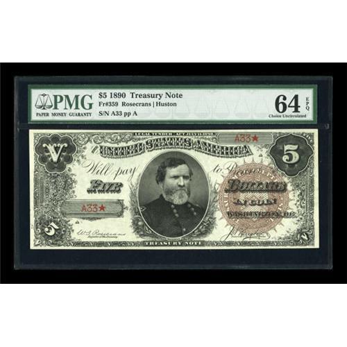 <B>Fr. 359 $5 1890 Treasury Note PMG Choice Uncirculated 64 EPQ.</B></I> A fabulous example that traces-back its history to the famed Grinnell sale. The face margins are quite pleasing and the color bold. This note also has the distinction of being a Donlon & Piek illustrated note until its sale in 1971. PMG's population report lists this example as the only 64 with three graded higher. <BR><BR><b>Shipping:</b> Coins & Currency (<a target="_blank" href="http://www.heritageauctions.com/common/shipping.php">view shipping information</a>)