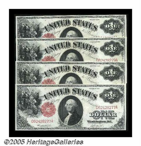 <B>Fr. 36 $1 1917 Legal Tender Gem Crisp Uncirculated.</B></I> A cut sheet of four with full and balanced margins all around on this issue which is typically quite closely cut on either the top or bottom. All four notes clearly more than meet the requirements for the Gem designation. A premium cut sheet that will please the fussiest buyer.