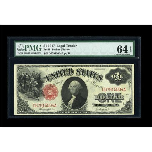 <B>Fr. 36 $1 1917 Legal Tender PMG Choice Uncirculated 64 EPQ.</B></I> A touch of staining in the margin that affects nothing is noticed on this wholly original USN.<BR><BR><b>Shipping:</b> Coins & Currency (<a target="_blank" href="http://www.heritageauctions.com/common/shipping.php">view shipping information</a>)
