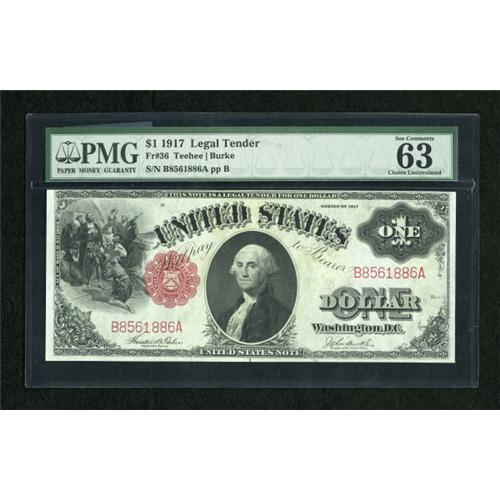 <B>Fr. 36 $1 1917 Legal Tender PMG Choice Uncirculated 63 EPQ.</B></I> A tight top margin prevents a higher grade on this well embossed and perfectly original Ace.<BR><BR><b>Shipping:</b> Coins & Currency (<a target="_blank" href="http://www.heritageauctions.com/common/shipping.php">view shipping information</a>)