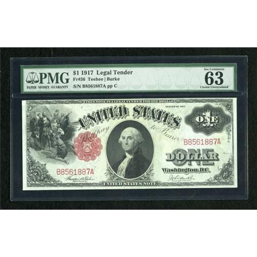 <B>Fr. 36 $1 1917 Legal Tender PMG Choice Uncirculated 63 EPQ.</B></I> The paper is appealing and wholly original. Clear embossing is noted on the serial numbers.<BR><BR><b>Shipping:</b> Coins & Currency (<a target="_blank" href="http://www.heritageauctions.com/common/shipping.php">view shipping information</a>)