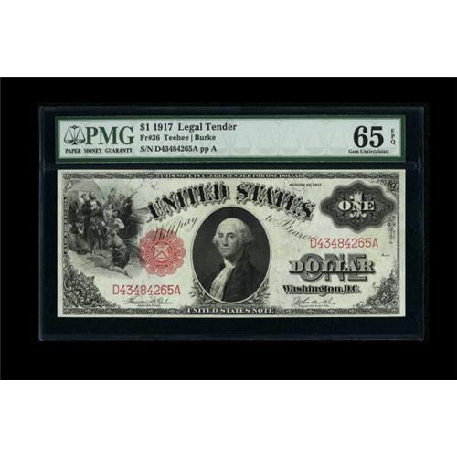 <B>Fr. 36 $1 1917 Legal Tender PMG Gem Uncirculated 65 EPQ.</B></I> This note displays excellent color along with decent centering. The first of a consecutive pair.<BR><BR><b>Shipping:</b> Coins & Currency (<a target="_blank" href="http://www.heritageauctions.com/common/shipping.php">view shipping information</a>)