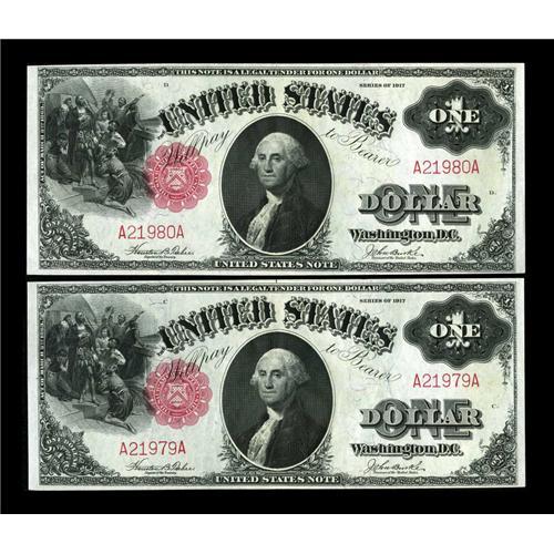<B>Fr. 36 $1 1917 Legal Tender Two Consecutive Examples.</B></I> This is a pair of attractive, original notes. The first note grades <B>Gem New</B></I> while the second note exhibits a light center bend and grades <B>Choice About New.</B></I><BR><BR><b>Shipping:</b> Coins & Currency (<a target="_blank" href="http://www.heritageauctions.com/common/shipping.php">view shipping information</a>)