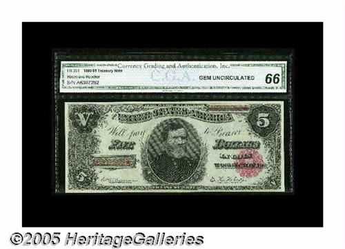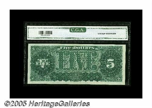 <B>Fr. 361 $5 1890 Treasury Note CGA Gem Uncirculated 66.</B></I> The "D" position note from this lovely sheet identical to the "A" note above.