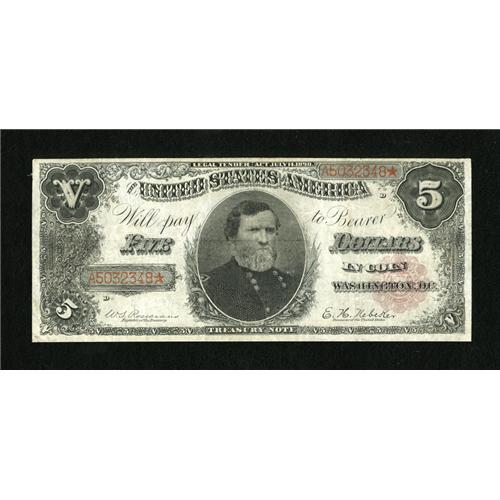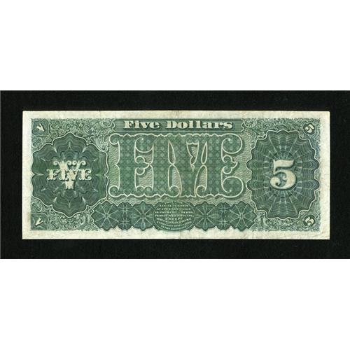 <B>Fr. 361 $5 1890 Treasury Note Fine-Very Fine.</B></I> A flat example with paper that is crisp and suggestive of a higher grade. The seal shows a touch of fading. 1890 $5 Treasury Notes are scarce in all grades, and the modest price for which this note will sell will attract a number of budget-conscious type collectors.<BR><I>From The Collection of Greg Southward</B></I><BR><BR><b>Shipping:</b> Coins & Currency (<a target="_blank" href="http://www.heritageauctions.com/common/shipping.php">view shipping information</a>)