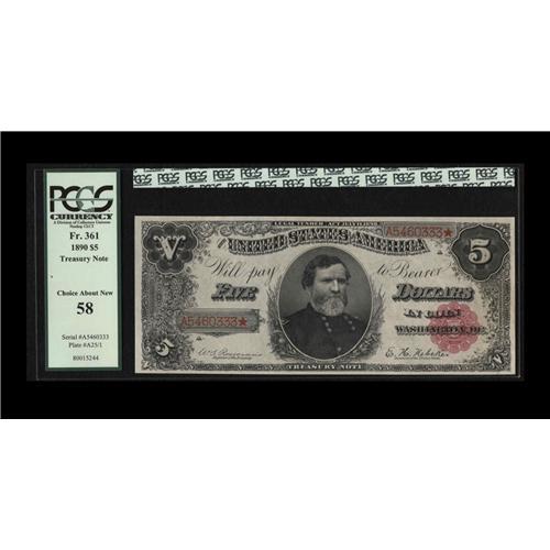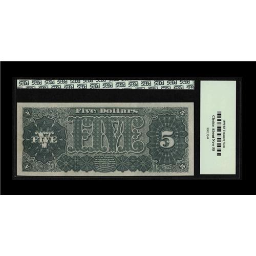 <B>Fr. 361 $5 1890 Treasury Note PCGS Choice About New 58.</B></I> A handsome 1890 Treasury Note with the elaborately engraved back featuring the large ornate "FIVE." This type has always been a particular favorite of this cataloger, a sentiment that seems to be shared by many, as these are always actively pursued at auction.