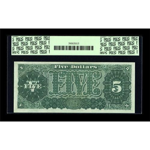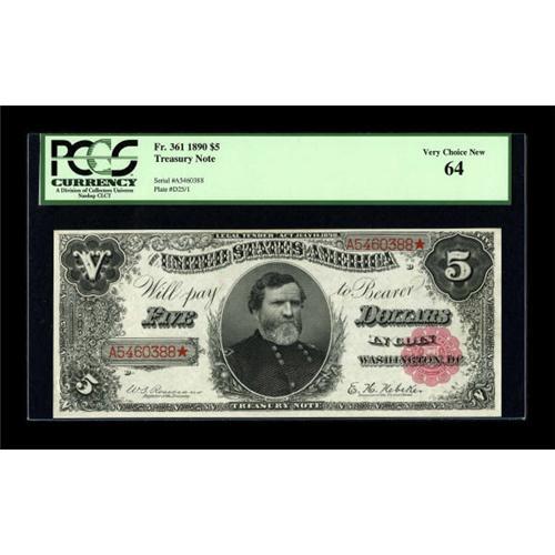 <B>Fr. 361 $5 1890 Treasury Note PCGS Very Choice New 64.</B></I> A strictly original example, with excellent color, strong embossing and lots of eye appeal. It's the D-position note from the plate, with a broader than normal bottom margin. A slightly small top margin is all that holds this Ornate Back Treasury Note from the Gem grade.<BR><BR><b>Shipping:</b> Coins & Currency (<a target="_blank" href="http://www.heritageauctions.com/common/shipping.php">view shipping information</a>)