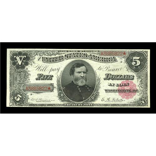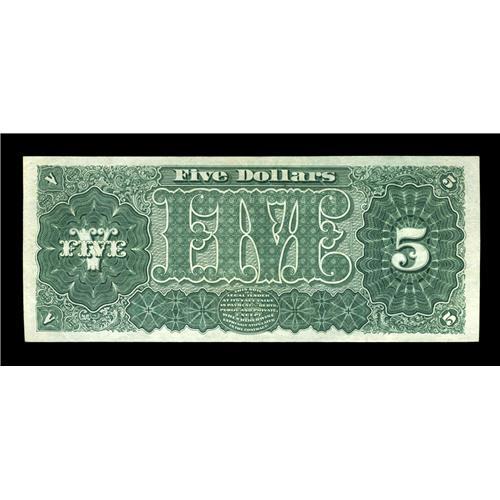 <B>Fr. 361 $5 1890 Treasury Note Very Choice New.</B></I> A near-Gem example of this popular 1890 Five Dollar Treasury Type. The note has margins that fall just short of the full Gem grade, and it also possesses excellent paper originality, bright colors and terrific eye appeal. That which appears at a glance to be a corner fold at the lower left is a perfectly natural, as made "earthquake" in the paper.