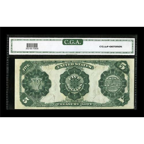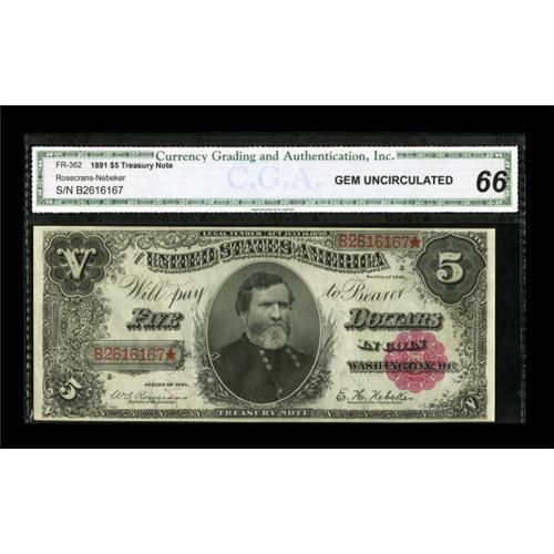<B>Fr. 362 $5 1891 Treasury Note CGA Gem Uncirculated 66.</B></I> Punch through embossing of the serial numbers is noted on this fully margined Gem with pleasing paper waves.<BR><BR><b>Shipping:</b> Coins & Currency (<a target="_blank" href="http://www.heritageauctions.com/common/shipping.php">view shipping information</a>)