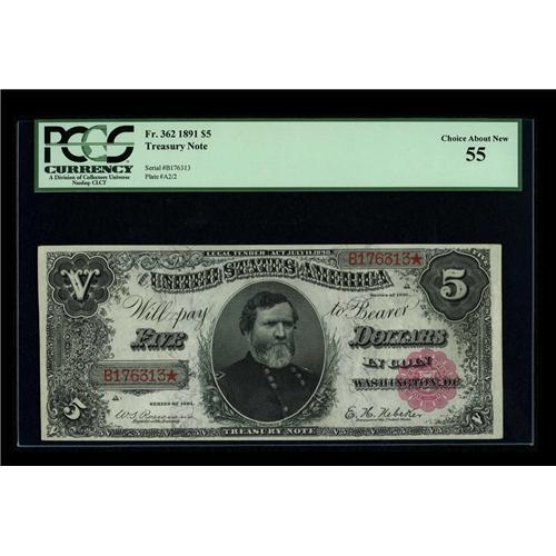 <B>Fr. 362 $5 1891 Treasury Note PCGS Choice About New 55.</B></I> Union Army General George Thomas graces the front of the note hidden for over 40 years. Thomas is considered by many students of the Civil War to be the most underrated of the Union generals. Just a touch of circulation has contributed to the grade assigned by PCGS.<BR><BR><b>Shipping:</b> Coin/Currency (<a target="_blank" href="http://www.heritageauctions.com/common/shipping.php">view shipping information</a>)