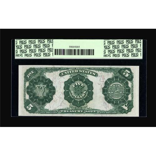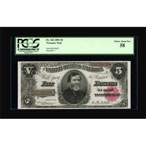 <B>Fr. 362 $5 1891 Treasury Note PCGS Choice About New 58.</B></I> The General Thomas "Open Back" Treasury Five has the visual appeal of a perfect Gem. We've no doubt that the folks at PCGS found a light fold somewhere, but we certainly can't see it through the holder. If eye appeal combined with budget constraints sounds like you, then this note should be yours.<BR><BR><b>Shipping:</b> Coins & Currency (<a target="_blank" href="http://www.heritageauctions.com/common/shipping.php">view shipping information</a>)