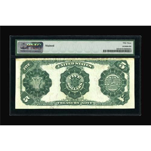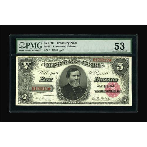 <B>Fr. 362 $5 1891 Treasury Note PMG About Uncirculated 53.</B></I> The face of this note is pleasing and boldly printed. There is however, some minor staining on the margin that is mostly confined to the top margin on back.<BR><BR><b>Shipping:</b> Coins & Currency (<a target="_blank" href="http://www.heritageauctions.com/common/shipping.php">view shipping information</a>)