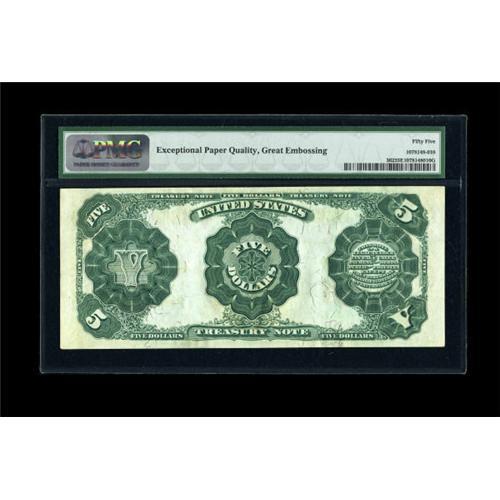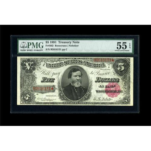 <B>Fr. 362 $5 1891 Treasury Note PMG About Uncirculated 55 EPQ.</B></I> This note is as original as one will find for the issue. The paper waves are obvious and the embossing is nearly punched through the paper.<BR><BR><b>Shipping:</b> Coins & Currency (<a target="_blank" href="http://www.heritageauctions.com/common/shipping.php">view shipping information</a>)
