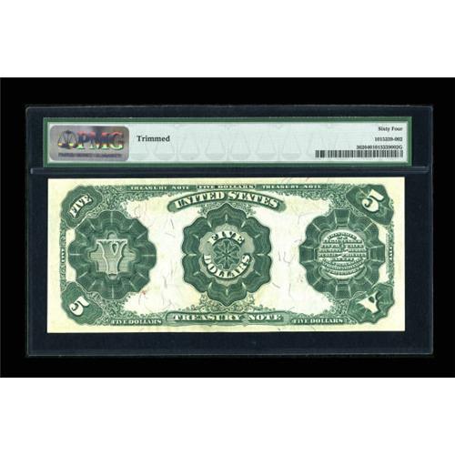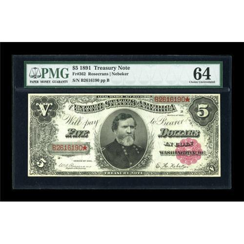 <B>Fr. 362 $5 1891 Treasury Note PMG Choice Uncirculated 64.</B></I> We have had only five notes of this Friedberg number with higher third party grades. This example has bright paper to go along with its dark red ink third printing. The PMG holder reads "trimmed" on this example.<BR><BR><b>Shipping:</b> Coins & Currency (<a target="_blank" href="http://www.heritageauctions.com/common/shipping.php">view shipping information</a>)