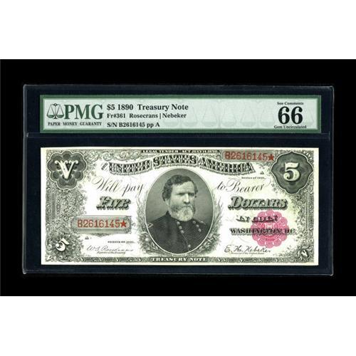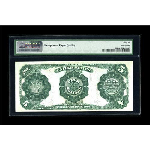 <B>Fr. 362 $5 1891 Treasury Note PMG Gem Uncirculated 66 EPQ.</B></I> We are pleased with the quality of this note and feel the margins and paper quality are closer to Superb than most other Gems. Punch through embossing is noted on both sides.<BR><BR><b>Shipping:</b> Coin/Currency (<a target="_blank" href="http://www.heritageauctions.com/common/shipping.php">view shipping information</a>)