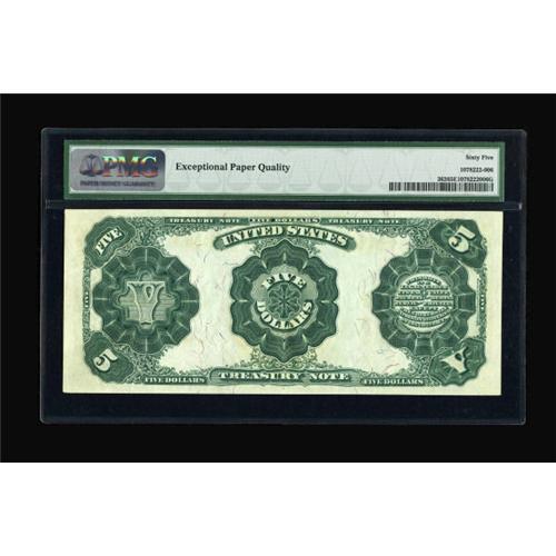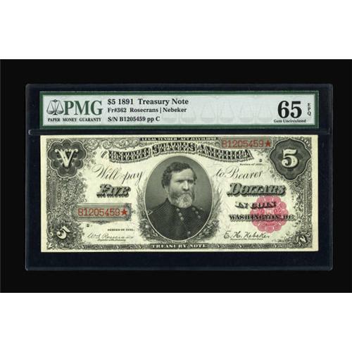 <B>Fr. 362 $5 1891 Treasury Note PMG Gem Uncirculated 65 EPQ.</B></I> This General Thomas note is from a run of Uncirculated notes. Although this particular piece has never been offered at auction, its pack-mates have. This note grades similar to its pack-mates. It has excellent color and good paper originality, as evidenced by the EPQ designation. Save for the tight top and bottom margins on the face and the soft corners, this note could easily make its way into a higher holder. <BR><BR><b>Shipping:</b> Coins & Currency (<a target="_blank" href="http://www.heritageauctions.com/common/shipping.php">view shipping information</a>)