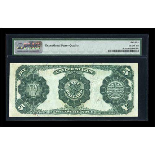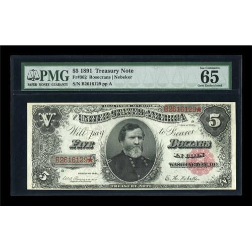 <B>Fr. 362 $5 1891 Treasury Note PMG Gem Uncirculated 65 EPQ.</B></I> PMG has graded a handful of notes right around this level, but there are always more customers for Gem Treasury Fives than there are notes available. This one is in an earlier PMG holder, with the "Exceptional Paper Quality," comment only on the back. PMG switches these out to the EPQ holders at no charge. A handsome note that deserves to attract quite a number of bidders.<BR><BR><b>Shipping:</b> Coins & Currency (<a target="_blank" href="http://www.heritageauctions.com/common/shipping.php">view shipping information</a>)