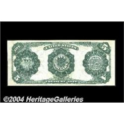 Fr. 362 $5 1891 Treasury Note Superb Gem New. Ideal centering on both sides, beautifully bright colors, deep original embossing, and spectacular eye appeal, all combine on this flashy, open-back Treasury five. <BR><BR><B>Important notice:</B> Heritage usually auctions material at the rate of 200-250 lots per hour. On some occasions eBay Live bid software or the Internet may not be able to keep up with the pace of the auction. We recommend placing a realistic absentee bid now as insurance to avoid disappointment. Occasionally the auctioneer may eliminate or reject an eBay Live bid, and the auctioneer may also reopen a lot after the close of the eBay live bidding (usually because we missed an audience bid), and may reject your bid even if it shows you as the winning bidder. By bidding via eBay Live, you agree that Heritage may award the lot to another bidder at its sole discretion under the circumstances described above or any other reasonable circumstances. Since eBay bids are not shown to us until we open the lot on the floor, we treat those bids just like floor bids. In most cases the floor responds before the eBay bid is presented to us, due to Internet lag time, so for consistency we have made it a policy that floor bids are always considered first over tie eBay live bids. Also please note that all Heritage lots purchased through eBay Live carry a 20% Buyer's Premium. Please make sure you read the Terms and Conditions before you bid. <BR><BR><B>IMPORTANT ANNOUNCEMENT ABOUT RESERVES:</B> Heritage now divulges all reserves on its web site 7 days before every auction. If you want to know whether the reserve on this lot has been met, and if not, what the reserve amount is, please visit this lot page on the HeritageCoin.com web site, or email: bid@HeritageGalleries.com