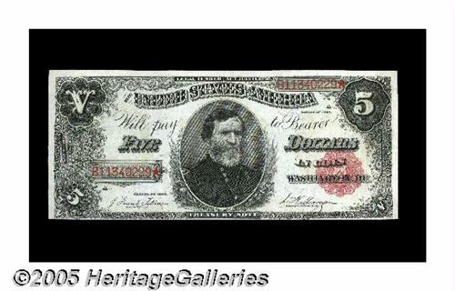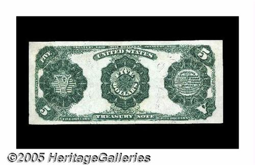 <B>Fr. 363 $5 1891 Treasury Note Choice About Uncirculated.</B></I> A faint center fold is detected on this Thomas $5. The switch from Ornate Back to Open Back designs for the Treasury Notes was necessitated by new currency paper that now had red and blue silk fibers running in two rows.