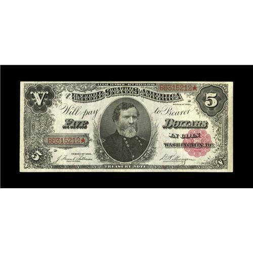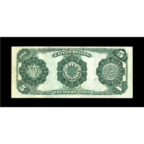 <B>Fr. 363 $5 1891 Treasury Note Extremely Fine.</B></I> Broad margins and pleasing paper originality add to this Treasury Note. When viewing the back, the embossing of the serial numbers and seal are still readily visible.<BR><BR><b>Shipping:</b> Coin/Currency (<a target="_blank" href="http://www.heritageauctions.com/common/shipping.php">view shipping information</a>)