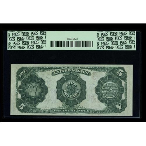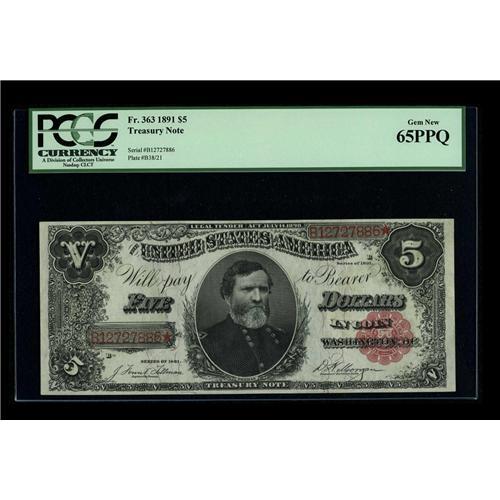 <B>Fr. 363 $5 1891 Treasury Note PCGS Gem New 65PPQ.</B></I> A lovely note, with fully bright color, broad margins and a razor-sharp portrait of General George H. Thomas. Although born in Virginia, he became an important and popular Union Civil War General.<BR><BR><b>Shipping:</b> Coin/Currency (<a target="_blank" href="http://www.heritageauctions.com/common/shipping.php">view shipping information</a>)
