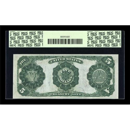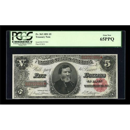 <B>Fr. 363 $5 1891 Treasury Note PCGS Gem New 65PPQ.</B></I> It's hard to imagine that there are still five grade levels remaining above this note, as there just doesn't seem to be that much room between this lovely piece and perfection. The margins are excellent, the color simply perfect, and the vibrancy of this General Thomas 1891 Treasury Five cannot be topped. PCGS has graded 21 examples of this Friedberg number, but not a single piece has yet been graded above this 65PPQ level.<BR><BR><b>Shipping:</b> Coins & Currency (<a target="_blank" href="http://www.heritageauctions.com/common/shipping.php">view shipping information</a>)
