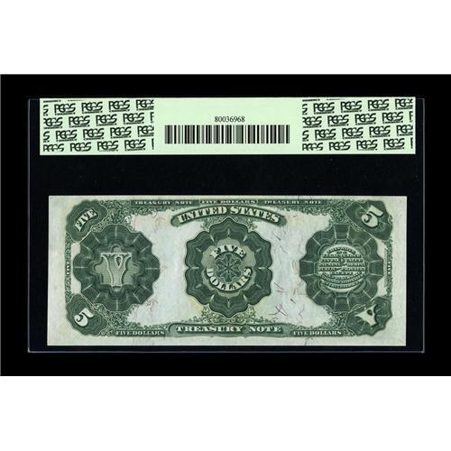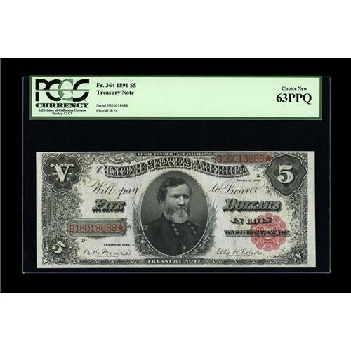 <B>Fr. 364 $5 1891 Treasury Note PCGS Choice New 63PPQ.</B></I> A tight top margin is all that holds this strictly original, beautifully bright Treasury Five from the Gem grade.<BR><I>From The Bill and Kathy Stella Currency Collection</B></I><BR><BR><b>Shipping:</b> Coin/Currency (<a target="_blank" href="http://www.heritageauctions.com/common/shipping.php">view shipping information</a>)