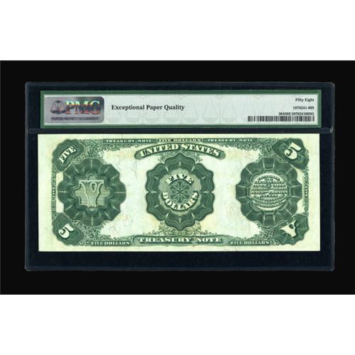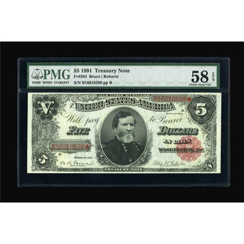 <B>Fr. 364 $5 1891 Treasury Note PMG Choice About Unc 58 EPQ.</B></I> A corner fold at upper right is the reason this note has not been called Gem New. A lovely Thomas which should achieve a high price despite its assigned grade.<B><BR></B></I><I>From The Warren Marshall Collection</B></I><BR><BR><b>Shipping:</b> Coins & Currency (<a target="_blank" href="http://www.heritageauctions.com/common/shipping.php">view shipping information</a>)