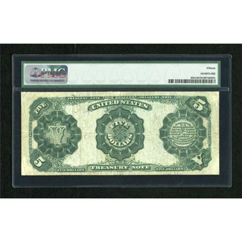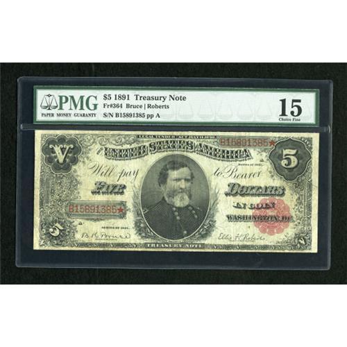 <B>Fr. 364 $5 1891 Treasury Note PMG Choice Fine 15.</B></I> This open back Treasury Note is wholly original and attractive for the grade. The margins are especially large and the paper problem free.<BR><BR><b>Shipping:</b> Coins & Currency (<a target="_blank" href="http://www.heritageauctions.com/common/shipping.php">view shipping information</a>)