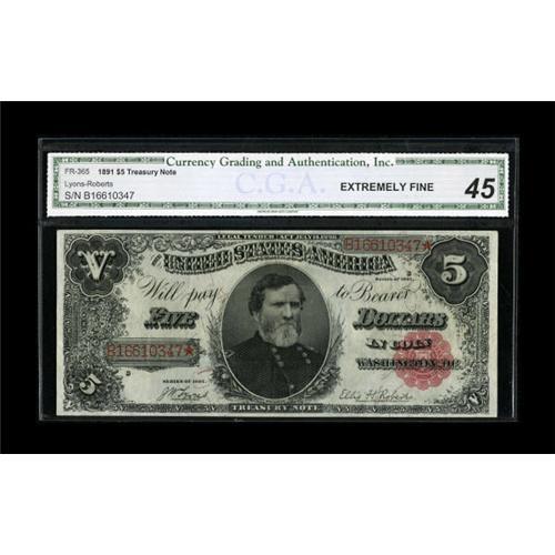 <B>Fr. 365 $5 1891 Treasury Note CGA Extremely Fine 45.</B></I> This evenly circulated is well margined and remains bright.<BR><BR><b>Shipping:</b> Coins & Currency (<a target="_blank" href="http://www.heritageauctions.com/common/shipping.php">view shipping information</a>)