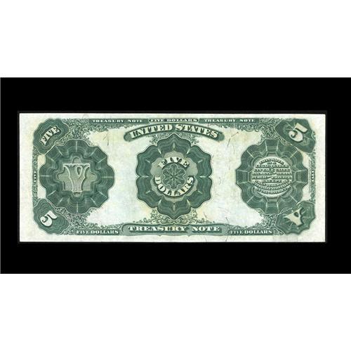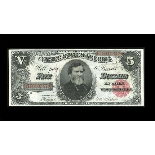 <B>Fr. 365 $5 1891 Treasury Note Choice Very Fine.</B></I> Final number of the Treasury Fives and one that is rare in all grades. This series spans four signature combinations. There are 110 Fr. 362s, approximately 175 Fr. 363, 120 Fr. 364s, and less than two dozen Fr. 365s. H-CAA has sold only a single low-grade example and CAA has handled only a few in our sixteen-year history. An under appreciated sleeper number, that could easily realize...